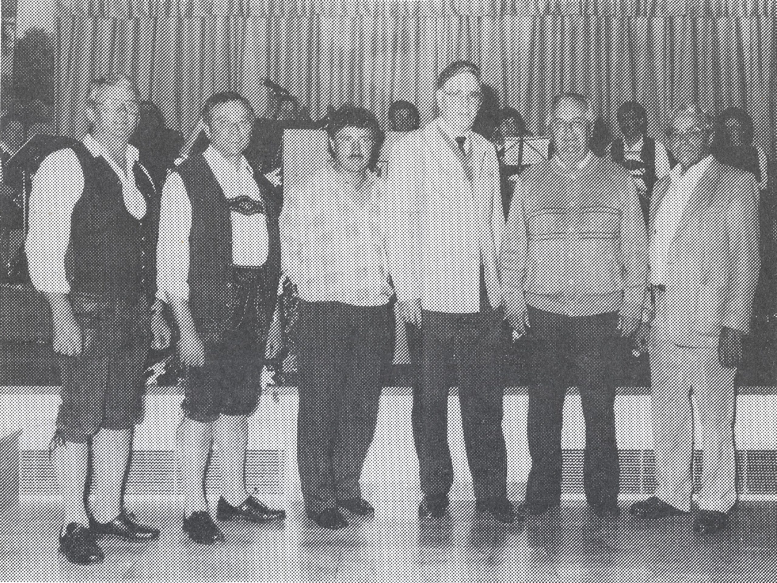 Die Vorstandschaft des Vereins zur Förderung der Musikkapelle Fridolfing am 11.06.1990 von links nach rechts:: Kapellmeister Matthäus Gierlinger, Georg Reitinger, Karl Stöckl, Dr. Bernhard Kurz, Friedrich Gierlinger und Vorsitzender Josef Mörtel